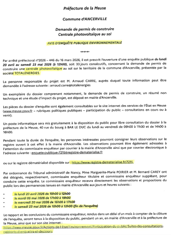 AVIS D'ENQUÊTE PUBLIQUE - CENTRALE PHOTOVOLTAÏQUE - TOTAL ENERGIE